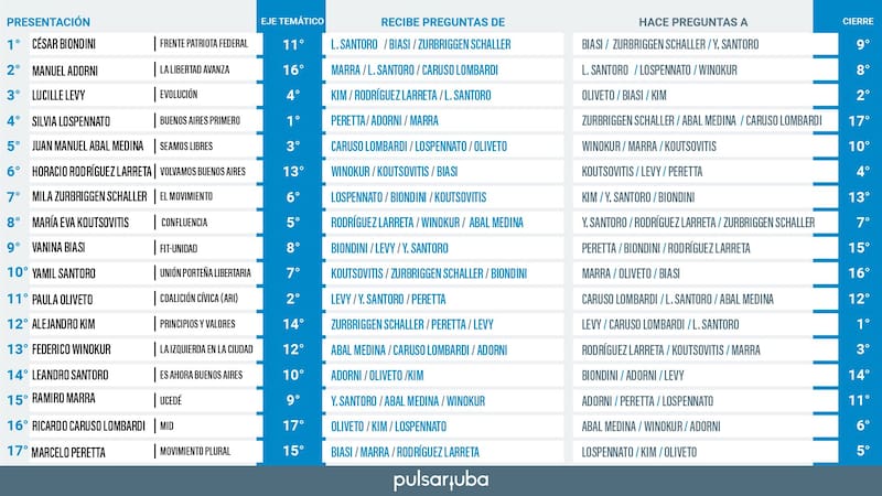 El debate pautado para las 20 tuvo lugar en la sede del Canal de la Ciudad, sin público. Muchas de las fuentes de distinto partido político consultadas por El Cronista coincidieron en que será un cruce muy pautado y donde poco se podrá decir al ser tantos candidatos. Aunque existía la posibilidad de que Manuel Adorni no acudiera y lo reemplazara la segunda en su lista, el vocero presidencial apareció anteúltimo sonriente en el barrio porteño de Once.