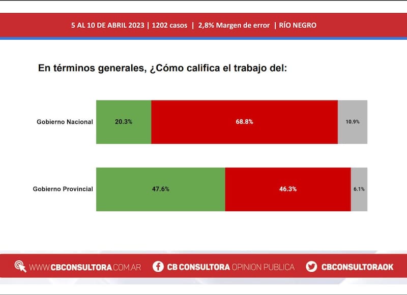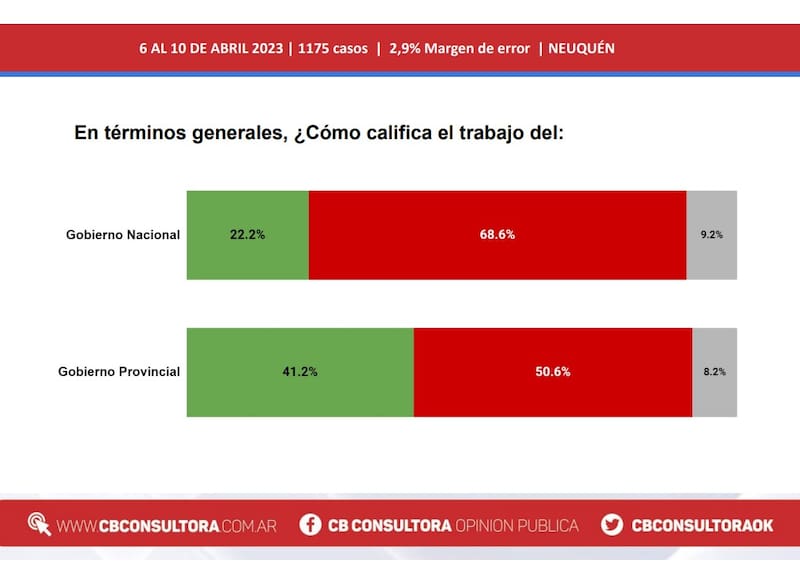 Respecto al Gobierno Provincial, también se percibió una opinión mayoritariamente negativa, con un 50,6% expresándose de esa manera frente a un 41,2% que se manifestó positivamente, mientras que un 8,2% dijo no saber.