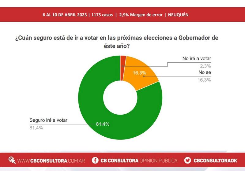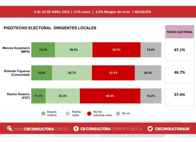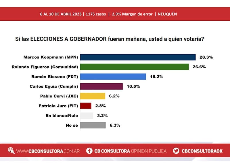 La misma consultora también realizó una encuesta similar para las elecciones neuquinas, que se realizarán el mismo día que las de su provincia limítrofe. Sin embargo, los resultados no señalan un ganador claro. En términos generales, todo indica una carrera de tres, con los dos primeros cabeza a cabeza.