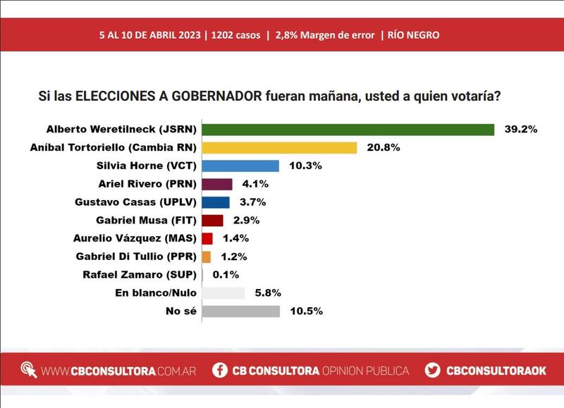Frente a la pregunta "¿Si las elecciones a gobernador fueran mañana, usted a quién votaría?", un 39,2% optó por Weretilneck, un 20,8% por Tortoriello, un 10,3% por Horne, 5,8% dijo que votaría en blanco y un 10,5% dijo que no sabía. Los otros 6 candidatos que aparecían en la encuesta obtuvieron porcentajes inferiores al 5%.