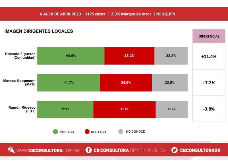 El diputado nacional y exvicegobernador Rolando Figueroa, del partido Comunidad es el que mejor imagen tiene, con un 44,6% de positividad, 33,6% de negatividad y 22,2% de desconocimiento.