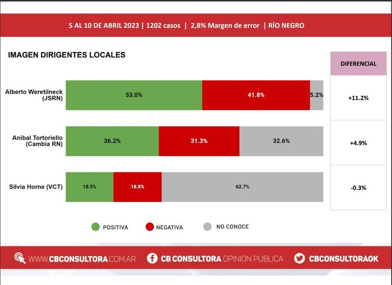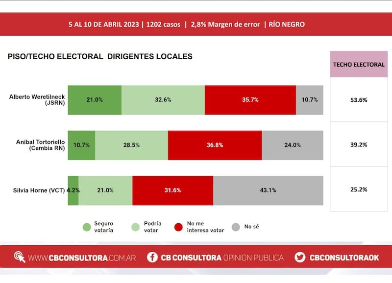 También preguntaron por los posibles pisos y techos electorales de estos tres candidatos. Sobre Weretilneck, un 21% dijo que seguro lo votaría, un 32,6% que podría votarlo, un 35,7% que no le interesa votarlo y un 10,7% dijo que no sabía. Es decir, un piso del 21% y un techo del 53,6%.