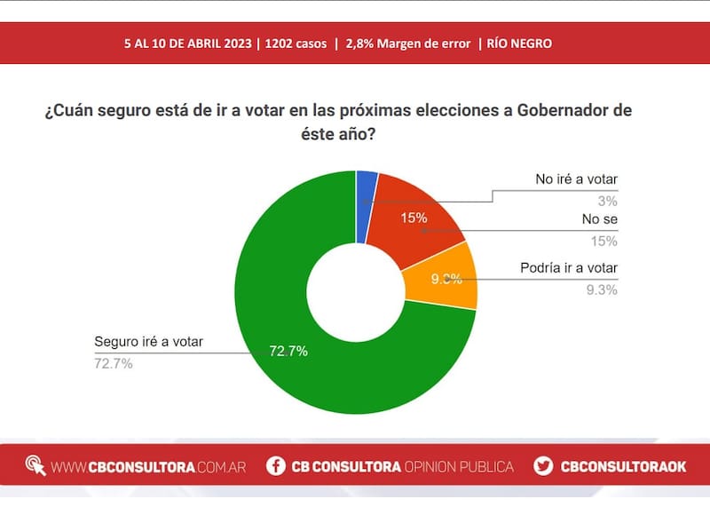 Ante la pregunta "¿Cuán seguro está de ir a votar en las próximas elecciones a gobernador de este año?", un 72,7% expresó que seguro irá a votar, un 15% que no sabe si lo hará, un 9,3% que podría hacerlo y solo un 3% que no irá a votar. Si solo tomamos los afirmativos, está en línea con el porcentaje de participación de la elección a gobernador de 2019, que contó con una presencia del 73.79% del electorado.