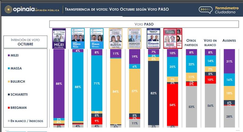 Por otro lado, el candidato de UP es quien mejor logra capitalizar el voto de otras fuerzas políticas, y de los que votaron en blanco, con un 22% y 14% respectivamente. Sin embargo, Milei es, con un 31%, quien mejor convocaría a aquellos que se ausentaron en las PASO.