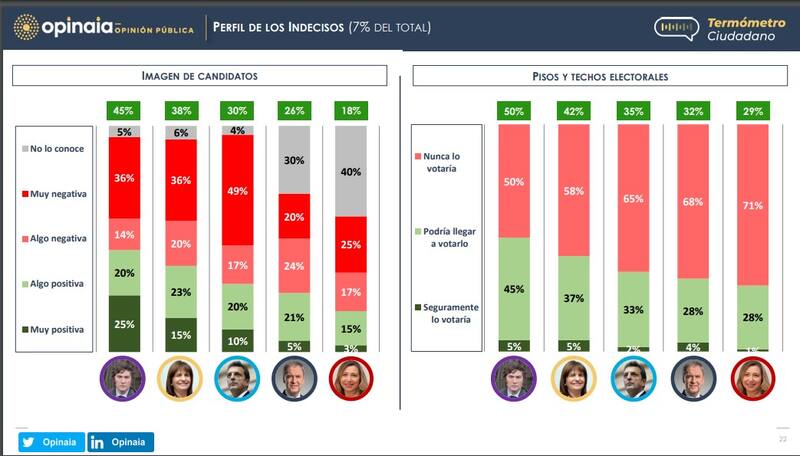 El sondeo analizó de forma particular la imagen de los candidatos y el piso y techo que le otorga la porción del electorado "indeciso". Del resultado se desprende que Milei es que tiene valoración positiva más alta (45%), y Massa el que tiene valoración más negativa (49%).