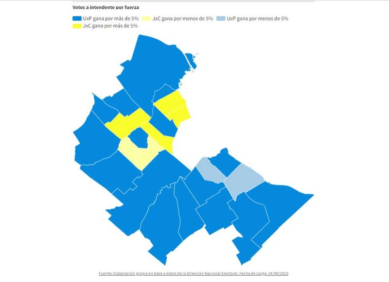 Por otro lado, el bloque libertario logró imponerse como segunda fuerza mayoritaria a Juntos por el Cambio en municipios donde ganó Unión por la Patria: Berazategui, Florencio Varela, Ezeiza, Merlo, Moreno y José C Paz.