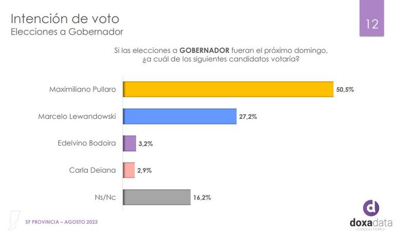 De hecho, más de la mitad del electorado que participó del relevamiento optó por el candidato único de JxC, Maximiliano Pullaro (50,2%). Relegado en segundo lugar el candidato del oficialismo, Marcelo Lewandowski alcanzó el 27,2%.