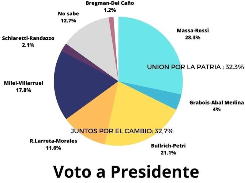 Sin embargo, el mismo sondeo en base a 2.596 entrevistas telefónicas muestra que la exministra Patricia Bullrich obtendría el 21,1% de los votos y su rival en Juntos por el Cambio, el alcalde de Buenos Aires Horacio Rodríguez Larreta, el 11,6%, otorgando una leve ventaja global a la oposición.
