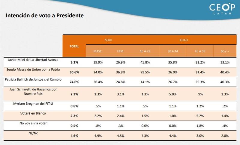 Según la encuesta de CEOP Latam, Javier Milei tiene mayor aceptación entre los hombres (39,9%), de 16 a 29 años (45,8%) y de 30 a 44 años (35,8%) -el libertario se impone en los dos grupos etáreos- mientras que queda muy parejo en el rango de 45 a 59 años (31,2%) con Sergio Massa (31,4%).