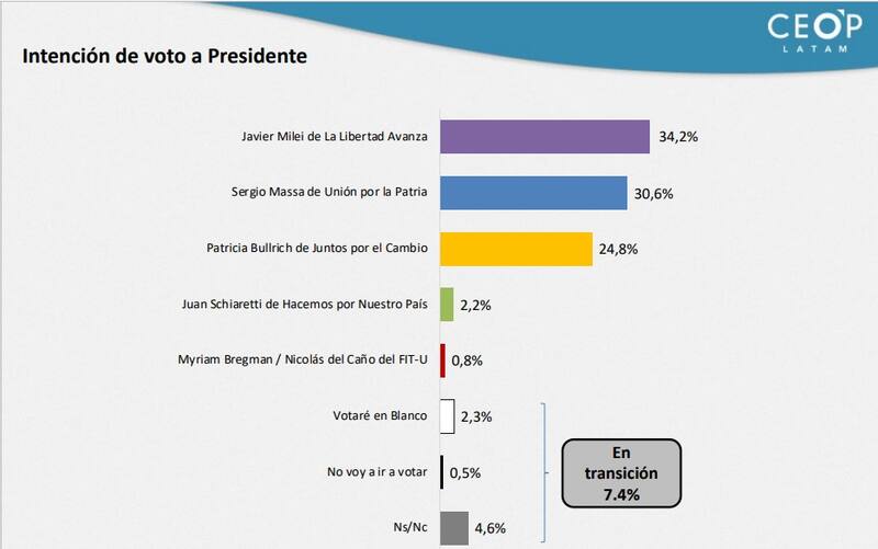 El sondeo, realizado entre el 22 y el 30 de agosto, muestra a Javier Milei (La Libertad Avanza) a la delantera de la carrera presidencial con un 34,2% de intención de voto, casi cinco puntos por arriba de su resultado en las PASO.