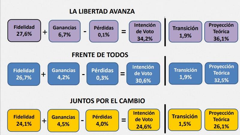 Así surge de la Matriz de Fidelidad, que consiste en cruzar la Intención de Voto actual con el voto emitido en la elección anterior, para detectar la estructura del caudal de votos logrados en cada trabajo de campo por cada frente o partido. Este indicador se obtiene a partir de un algoritmo de dos dimensiones: Intención de Voto-producto del valor de la fidelidad (con relación al voto anterior) más las ganancias y menos las pérdidas- y la proyección -el valor más crítico, dado lo ocurrido en 2021-.