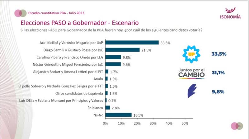 El informe también consultó a los participantes sobre a quiénes votarían si las elecciones fuesen hoy. El 33,5% aseguró que votaría a Kicillof-Magario (UxP); el 21,5%, a Santilli-Posse(JxC); el 9,8%, a Píparo-Oneto(LLA); el 9,6%, a Néstor Grindetti-Fernández(JxC) y el 1,7% dijo que a Bodart-Lattieri(FITU)