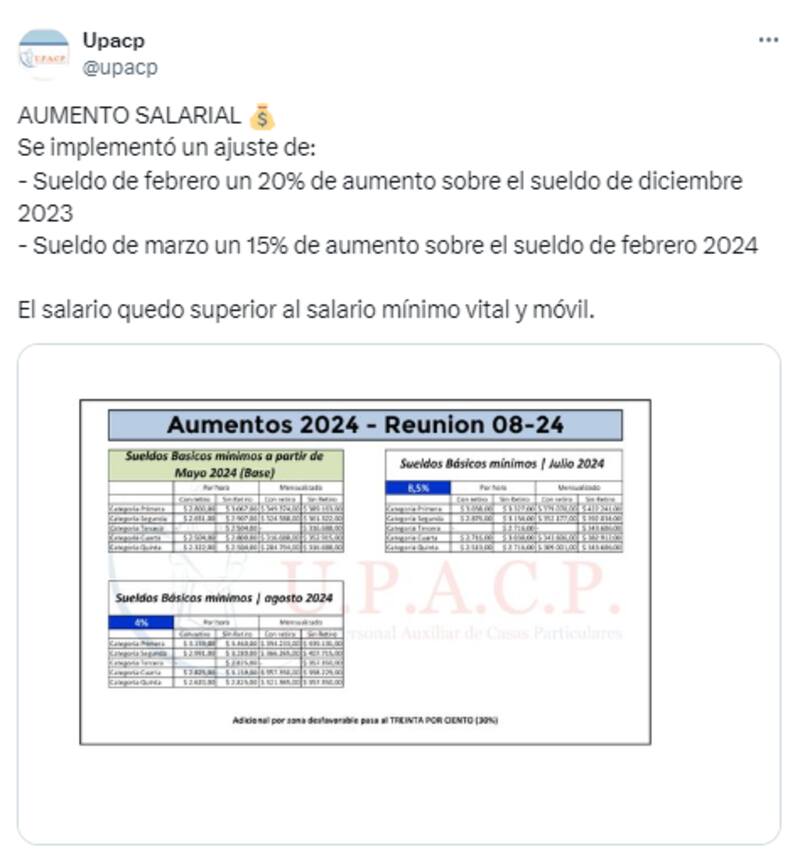 "Se implementó un ajuste de los sueldos de febrero (20% de aumento sobre el sueldo de diciembre 2023) y los de marzo (15% sobre el sueldo de febrero 2024)", especificaron desde la Unión del Personal Auxiliar de Casas Particulares (U.P.A.C.P.) en redes sociales.