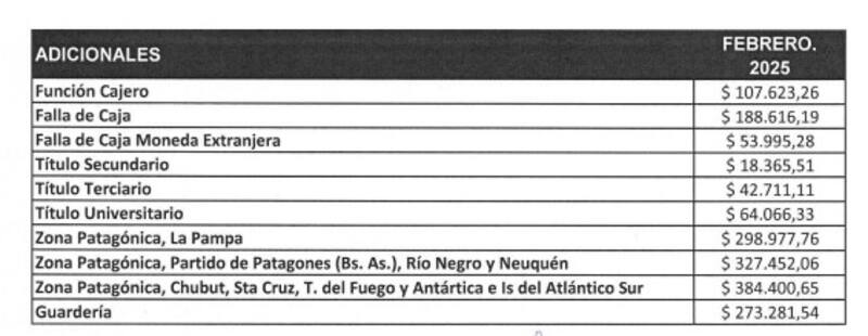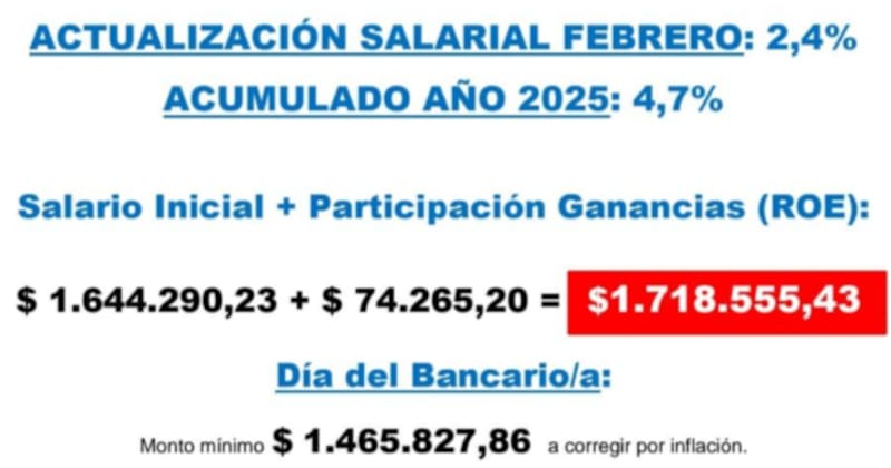 Además, y en relación al bono por el Día del Bancario, el mismo quedó en un monto mínimo de $ 1.465.827,86 a corregir por la inflación de los próximos meses.