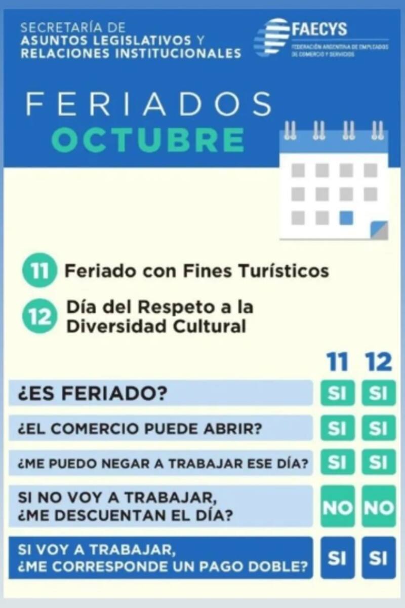 Los trabajadores mercantiles que presenten servicios el próximo viernes 11 y sábado 12 de octubre (feriado nacional) accederán a la liquidación doble de la jornada habitual.