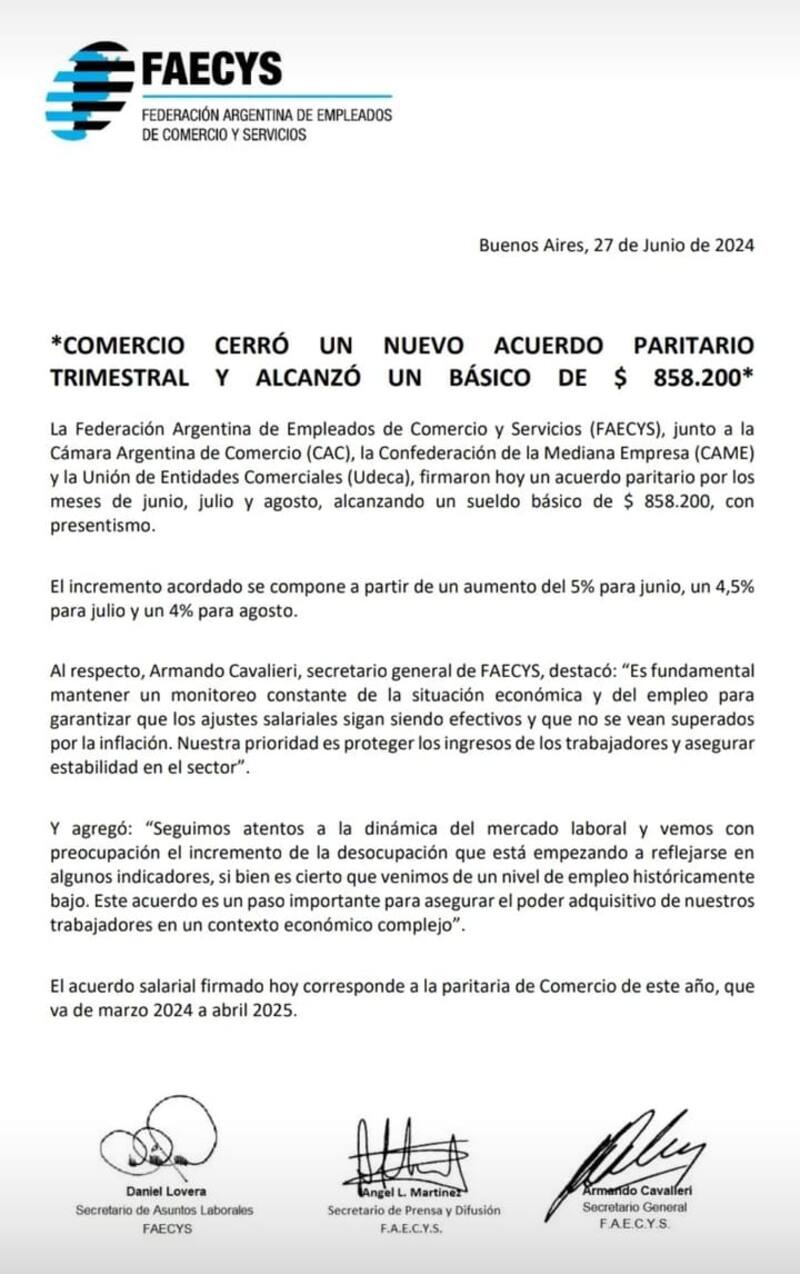 Los Empleados de Comercio de la rama general cobrarán en julio el primer tramo del aumento trimestral de 13,5% acordado el jueves entre el sindicato y las cámaras empresariales.
