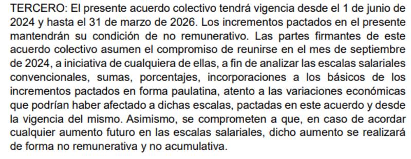 "Las partes firmantes de este acuerdo colectivo asumen el compromiso de reunirse en el mes de septiembre de 2024, a iniciativa de cualquiera de ellas, a fin de analizar las escalas salariales convencionales, sumas, porcentajes, incorporaciones a los básicos de los incrementos pactados en forma paulatina, atento a las variaciones económicas que podrían haber afectado a dichas escalas, pactadas en este acuerdo y desde la vigencia del mismo", puntualizó el punto 3° del acta signada en junio.