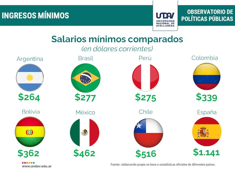Por encima se encuentra el haber en Perú con U$S 274, Brasil con U$S 276, Colombia (U$S 339), Bolivia (U$S 361) y Chile U$S 516. A modo de referencia, en España el haber mínimo equivale a U$S 1.141.