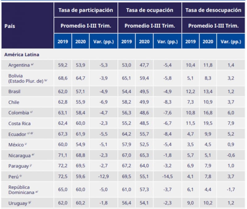 El organismo arrojó para el país una tasa de ocupación de 47,7% (contra 53% que había al mismo período de 2019) y una de desempleo de 11,8% (frente a un 10,4% de 2019). En tanto la tasa de participación es de 53,9% (frente a un 59% del año pasado). En todos los indicadores, las cifras son peores que el promedio regional, que apuntan a un 51,2% de tasa de ocupación, a un 57,2% de la de participación y 10,6% de desempleo.