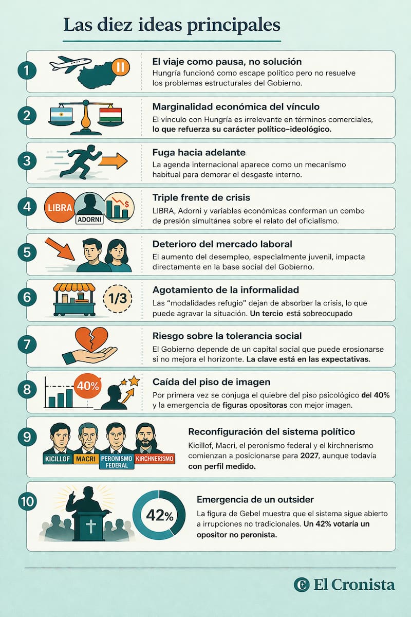 Budapest funcionó más como refugio que como plataforma. La sintonía con Viktor Orbán le ofrece a Milei un escenario cómodo, donde su narrativa encuentra eco. Pero esa comodidad externa contrasta con la incomodidad doméstica. Lo que se presenta como batalla cultural termina operando como una fuga hacia adelante.