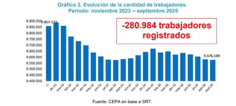 En el mismo período, la cantidad total de trabajadores registrados en unidades productivas cayó en 280.984 puestos, un descenso del 2,85%, lo que implicó una pérdida promedio de casi 420 trabajadores por día desde la asunción de Javier Milei.