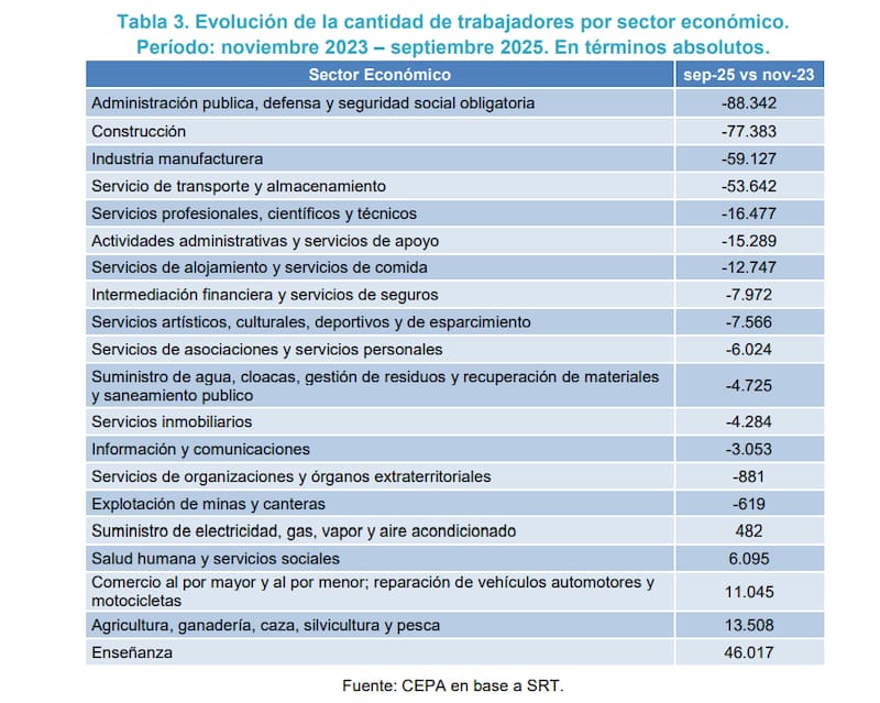 Un informe del Centro de Economía Política Argentina (CEPA), de filiación kirchnerista, profundizó el diagnóstico y amplió el horizonte temporal del análisis. Según ese trabajo, entre noviembre de 2023 y septiembre de 2025 se redujo la cantidad de empleadores con trabajadores registrados en 20.134 casos, lo que equivalió a unas 30 empresas menos por día.