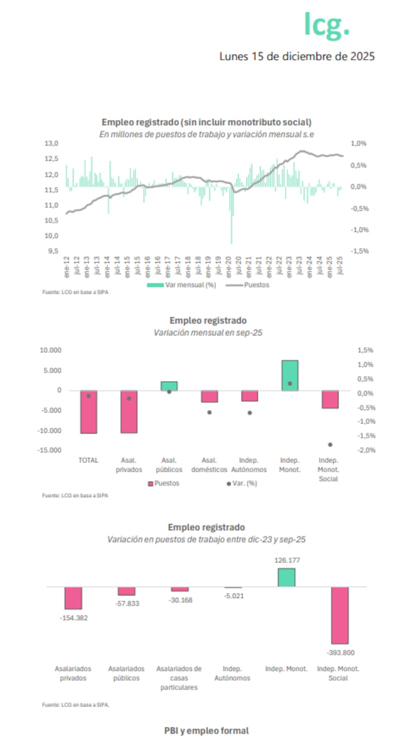 LCG también subrayó un rasgo que se repitió desde comienzos de año: el monotributo fue el único componente del empleo registrado que mostró crecimiento. En septiembre, la cantidad de monotributistas aumentó en 7.588 personas, más que compensando la caída de autónomos y de monotributistas sociales. Esa dinámica refuerza la lectura de que parte del ajuste del mercado laboral se canalizó hacia formas de inserción más precarias.
