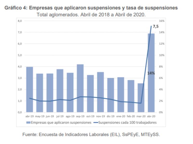 No obstante, la encuesta muestra que se disparó la cantidad de empresas que ejecutaron suspensiones, al punto total que en abril la tasa alcanzó al 7,5% de los trabajadores y al 14% de las compañías, más del doble de los máximos valores históricos.