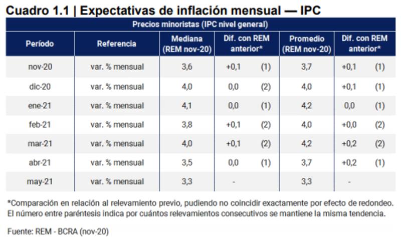 El anticipo de los economistas con sus relevamientos se encuentra en línea con lo que prevé el Relevamiento de Expectativas de Mercado (REM) que elabora el Banco Central en base a encuestas. Para el BCRA la inflación de diciembre será de 4% y la tendencia ascendente durará hasta enero de 2021, con una proyección de 4,1% de inflación mensual.