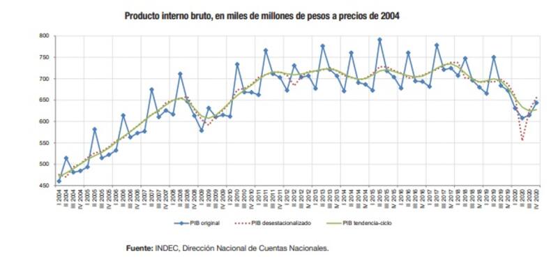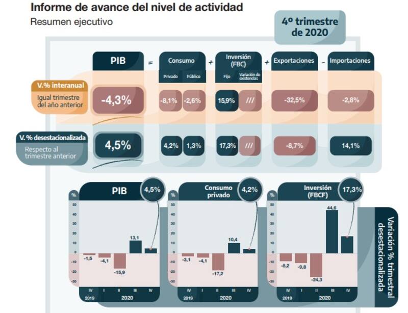 En el cuarto trimestre de 2020, el producto interno bruto (PIB) se expandió 4,5% en términos desestacionalizados en relación al trimestre anterior pero cayó 4,3% en comparación a período de 2019. Así lo reveló esta tarde el Instituto Nacional de Estadística y Censos (Indec).