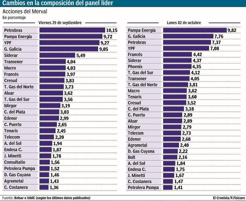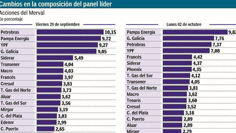 Otro cambio que se dará a partir de hoy es el retorno de Pampa como papel de mayor ponderación en el principal índice. Después de liderarlo durante el primer y segundo trimestre, vuelve a ser protagonista en el cuarto. De todas formas, Pampa apenas avanza, pasa de 9,72% a 9,82%, mientras que Petrobras Brasil, hasta el viernes primera en ponderación, cede de 10,15% a 7,3% y se ubica en el tercer puesto. Por otro lado, a diferencia de los últimos tres trimestres, ninguna acción logra alcanzar una ponderación de dos dígitos, o 10%.