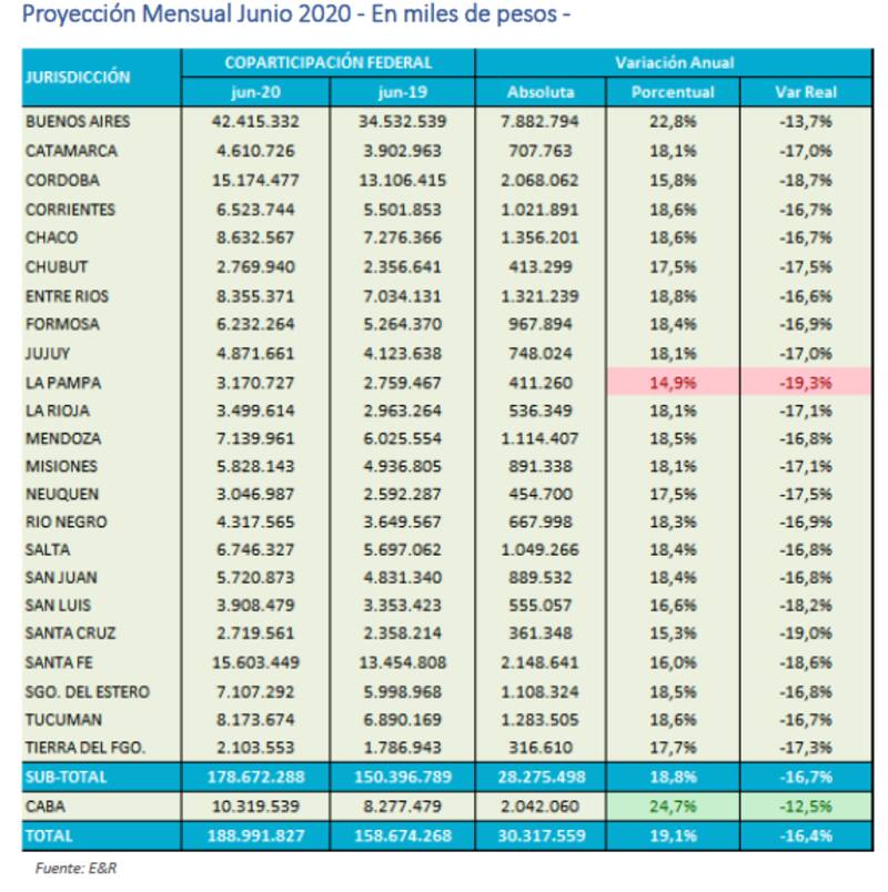 Para todo el año, E&R proyecta que el volumen de la coparticipación alcanzará los $ 188.991 millones en todo el mes y supere nominalmente en un 19,1% el monto de junio de 2019, lo que en términos reales se traduce en una caída de 16,5%.