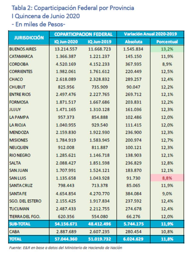 El volumen de los fondos transferidos de forma automática por coparticipación federal de impuestos de Nación a provincias alcanzó los $ 57.044 millones, lo que representa un crecimiento nominal de apenas 11,8% en la primera quincena de junio, según un informe de la consultora Economía & Regiones (E&R), que estima un incremento de 19,1% para todo el mes.
