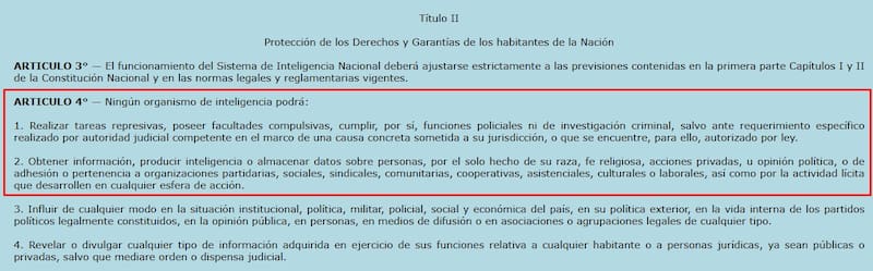 El artículo 4 de la Ley de Inteligencia Nacional es claro al respecto cuando establece que ningún organismo de inteligencia puede realizar tareas represivas, poseer facultades compulsivas, cumplir, por sí, funciones policiales ni de investigación criminal, salvo ante requerimiento específico realizado por autoridad judicial competenteen el marco de una causa concreta sometida a su jurisdicción, o que se encuentre, para ello, autorizado por ley.