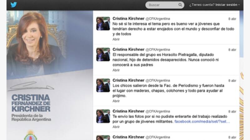 La presidenta Cristina Fernández es una fervorosa usuaria de estos métodos. Sus mensajes de twitter incluyen comentarios, reflexiones y anuncios que llevan el propósito de humanizarla, de mostrarla como una ciudadana más. Su lenguaje es cotidiano, desprovisto de formalismos, como si le estuviera hablando a la gente de igual a igual.