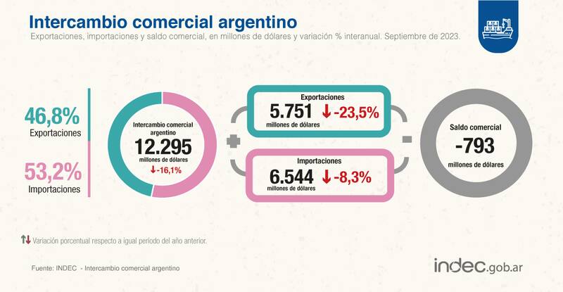 En septiembre, las exportaciones alcanzaron US$ 5.751 millones, con una caída de 23,5% interanual, y las importaciones US$ 6.544 millones, con una retracción de 8,3%, de acuerdo al informe Intercambio Comercial Argentino del Indec.