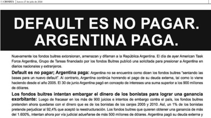 El Gobierno afirmó hoy en una nueva solicitada publicada en los principales matutinos que los fondos buitre “extorsionan, amenazan y difaman” al país, al tiempo que sostuvo que “default es no pagar” y “Argentina paga”.