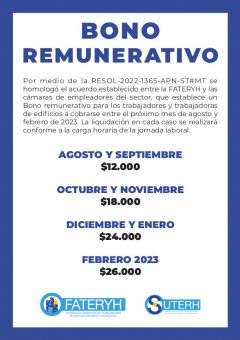 Los encargados de edificios englobados en la Federación Argentina de Trabajadores de Edificios de Renta y Horizontal (Fateryh) y el Sindicato Único de Trabajadores de Edificios de Renta y Horizontal (Suterh) iniciarán este martes con el cobro de las liquidaciones correspondientes a octubre 2022.