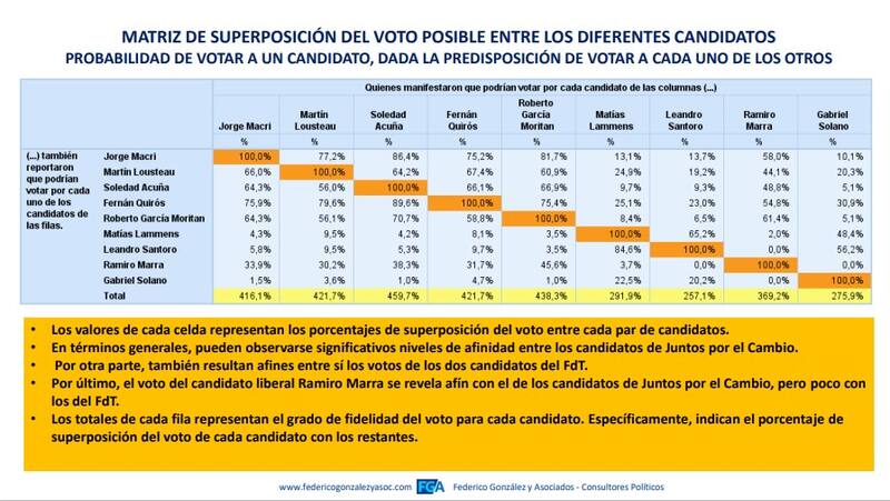 En términos generales, la encuesta exhibe significativos niveles de afinidad entre los candidatos de Juntos por el Cambio y en particular quienes eligen entre Lousteau o Macri. También quienes optan por Marra, de La Libertad Avanza, ven viable las opciones del PRO -Macri, Acuña y Quiró- y Evolución -Lousteau- como alternativas viables en caso de tener que elegir por una opción que no sea libertaria.