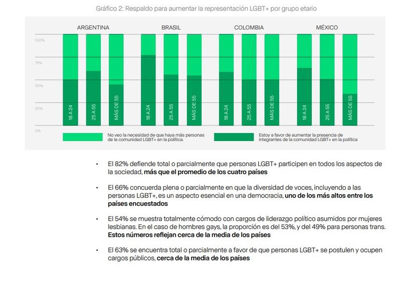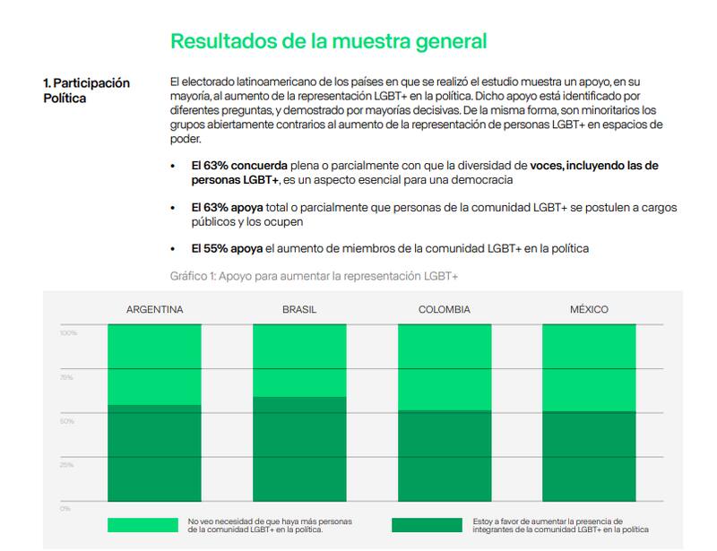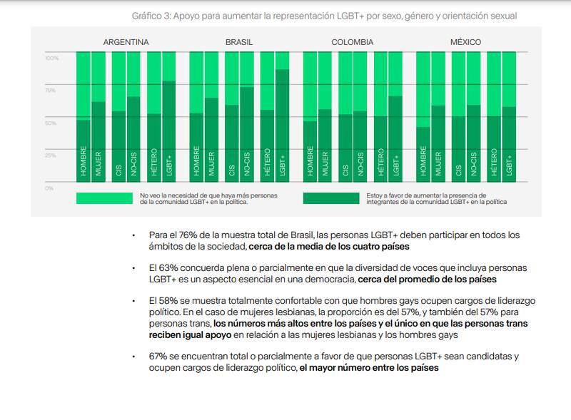 El estudio, que abarcó a 4.400 personas en Argentina, Brasil, Colombia y México, muestra, en general, un fuerte respaldo de la ciudadanía latinoamericana a una mayor representación LGBT+ en la política.