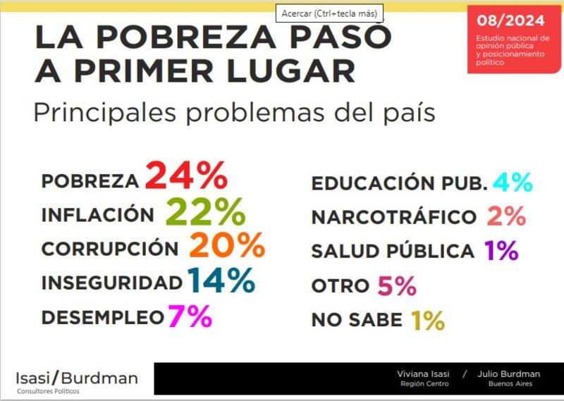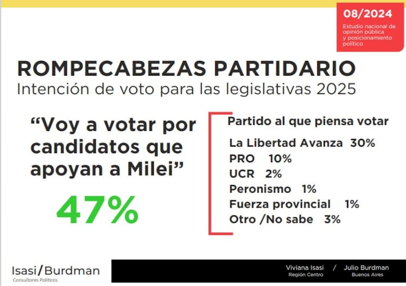 "Milei capitaliza el efecto Alberto", consignan Isasi y Burdman. "Aunque la pobreza se ubica en el primer lugar de los problemas nacionales, se consolida la imagen del presidente y su gabinete, crece su intención de voto 2025 y La Libertad Avanza se instala como la principal marca oficialista", sostienen acorde a las preferencias volcadas en su estudio.