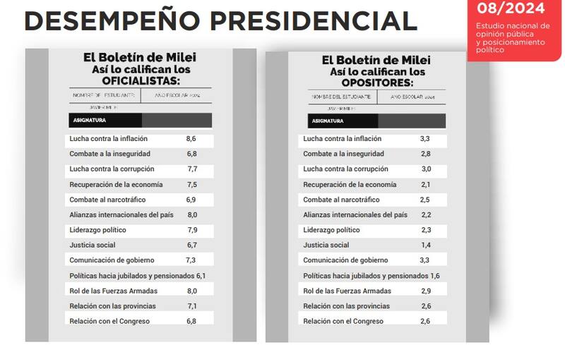 En el denominado "Boletín de Calificaciones del Presidente", que elaboran en el sondeo, "los votantes oficialistas califican muy positivamente sus promesas de campaña: lucha contra la inflación, alianzas internacionales, combate a la corrupción y liderazgo político" mientras que los votantes de la oposición reprueban en gran medida esas mismas materias.