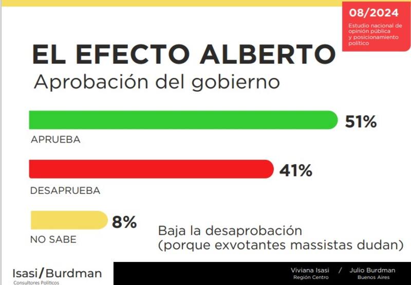 "El efecto Alberto cambia el mapa político", sostienen los politólogos Julio Burdman y Viviana Isasi en base a un trabajo de relevamiento realizado entre el 9 y 14 de agosto de 2024 en localidades de todo el país. "Tras el escándalo del expresidente cae la imagen de la oposición, su intención de voto 2025" - completan- e indican que "hay baja expectativa de renovación dirigencial".