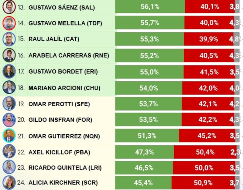 A contramano, en el fondo de la tabla, los tres que tienen indicadores negativos son Axel Kicillof (47% a favor y 50% en contra), Ricardo Quintela (46 y 50%) y Alicia Kirchner (45% y 51%).