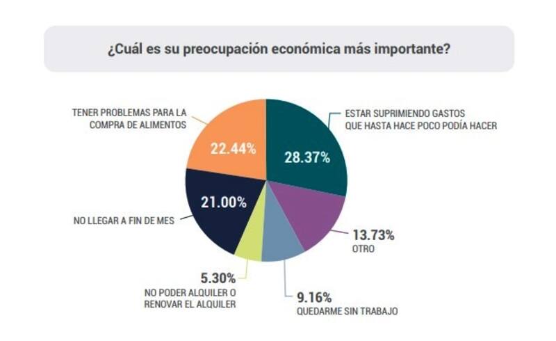 En este plano, las preocupaciones económicas de las personas se reparten de manera equitativa entre "estar suprimiendo gastos" (28,3%), registrar dificultades para comprar alimentos (22,4%) y "no llegar a fin de mes" (21%). Solo uno de cada diez teme perder su trabajo y el 5,3%, no poder pagar el alquiler.