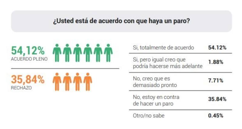 De hecho, el 36% dijo que el paro era "necesario (como medida) para que el Gobierno cambie su rumbo", mientras que el 19,1% lo describió como "la forma que encuentra la gente de expresar descontento con la situación económica". Apenas un 26,5% lo calificó como "un paro político de los que están en contra del Gobierno" y el 14,2% habló de "un paro hecho por la casta que no expresa a los trabajadores".