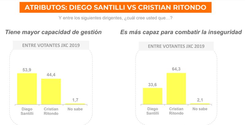 La encuesta pone la lupa en los dos candidatos más competitivos de Juntos por el Cambio, Santilli y Ritondo para hacer una serie de cuestionamientos. Por ejemplo, le pregunta a los encuestados que en 2019 votaron a la coalición opositora cuál de los dos tienen mayor capacidad de gestión. Ante ambas opciones, se impone Santilli.