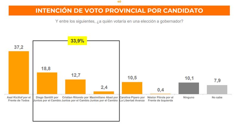 Es decir, Kicillof cosecha él solo más votos que la sumatoria tres candidatos de Juntos por el Cambio Diego Santilli, Cristian Ritondo y Maximiliano Abad. El trío sumaría el 33,9% si los votos fueran acumultativos. De ellos tres, el exfuncionario de Horacio Rodríguez Larreta, se muestra como el referente más competitivo del espacio, al cosechar casi el 19% de los votos.