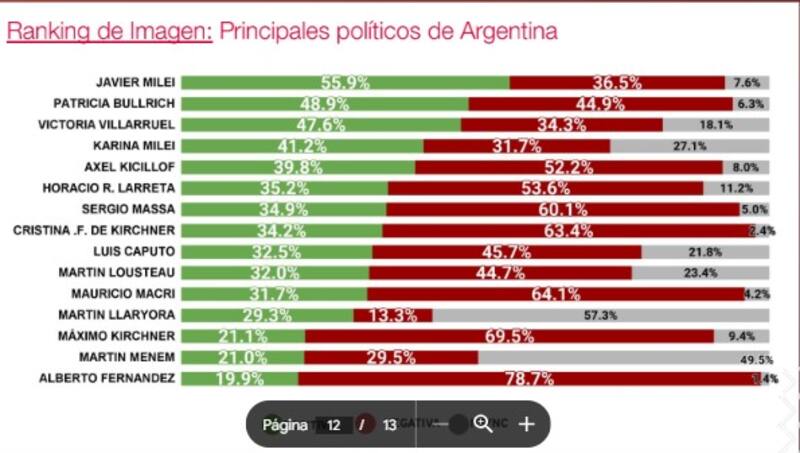 Completan el listado, la ministra de Seguridad, Patricia Bullrich (48,9%), la Vicepresidente Victoria Villarruel (47,6%) y la secretaria general de la Presidencia, Karina Milei con un 41,2%.