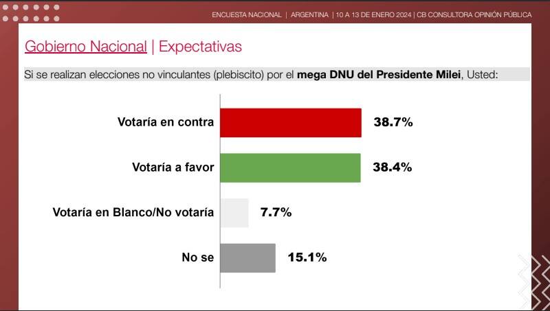 Ante la pregunta, ¿Si se realizan elecciones no vinculantes (plebiscito) por el mega DNU del Presidente Milei, usted...?, un 38, 7% expresó que votaría en contra y un 38,4%, a favor. El resultado determinó que pese a que un sector mayoritario respaldas las reformas que contempla el DNU, el conflicto está en el tratamiento para que sea aprobado.
